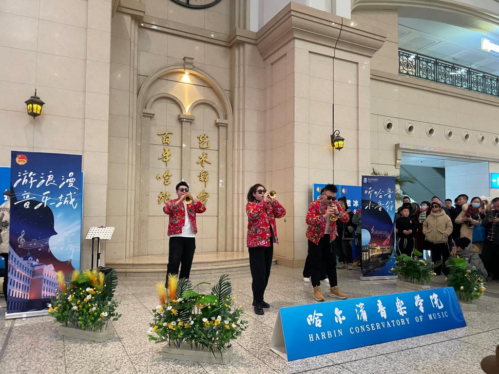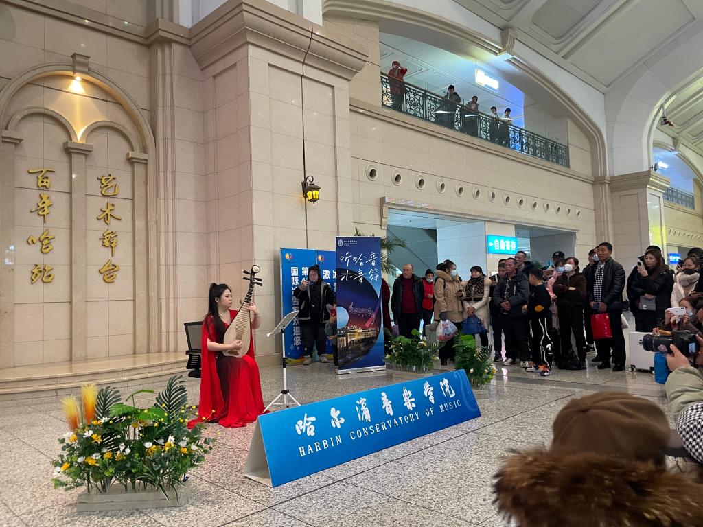 欢快的曲目、精湛的演奏吸引了火车站往来游客的驻足。一位即将返程的湖北游客说,今天能在火车站听到民乐的演奏十分幸运,这次旅行让我们在哈尔滨真正感受到了“音乐之城”的浪漫氛围,希望有机会还能来哈尔滨。