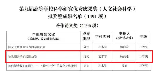 近日,教育部公布了第九届高等学校科学研究优秀成果奖(人文社会科学)拟奖励成果名单。院长杨燕迪教授的论文《论歌剧音乐的戏剧功能》获艺术学学科著作论文奖三等奖。这是学院建院以来首次获得高等学校科学研究优秀成果奖(人文社会科学),也是学院获得的首个国家级奖项。