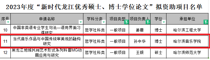 近日,省教育厅公示了2023年度“新时代龙江优秀硕士、博士学位论文”拟资助项目清单。我院作曲系孙中华教授的博士论文《当代音乐作品与中国传统审美观的融构研究》获批哲学社科类一般项目。这是学院首次获得该项目资助。