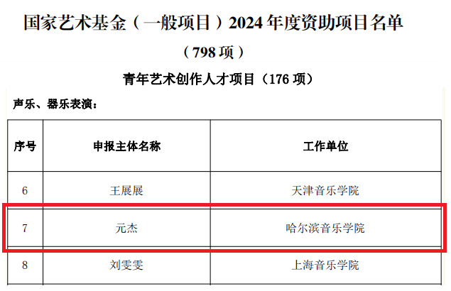 近日,国家艺术基金管理中心公示了《国家艺术基金(一般项目)2024年度资助项目名单》。学院钢琴系主任元杰教授的西洋乐器《传承红色基因 发扬抗联精神——创作和演出钢琴协奏曲<松花江上>》获批青年艺术创作人才项目(声乐、器乐表演)。这是建院以来学院教师首次获批青年艺术创作人才项目。