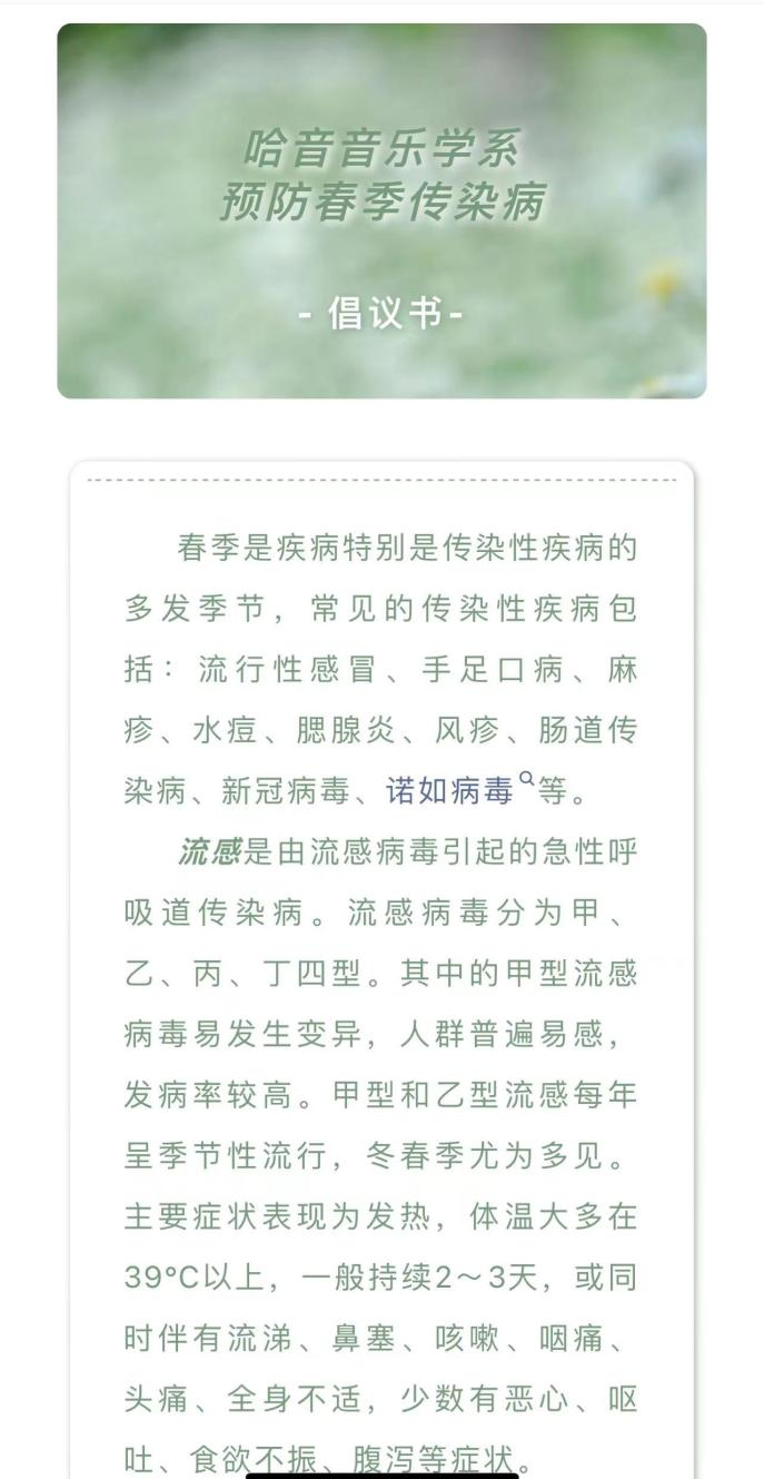 为提示同学们关爱健康,“哈音音乐学系”微信公众号推送了《预防春季传染病倡议书》,为广大同学介绍了春季常见的传染性疾病类型,预防春季传染病的方法。