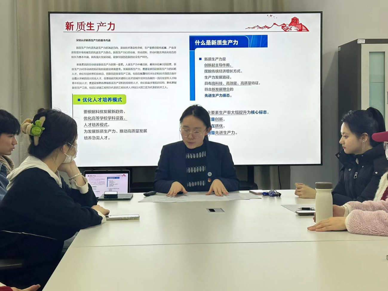 在4月9日下午,民族声乐系开展了“因地制宜发展新质生产力”主题班会。辅导员吴冰冰老师讲解“新质生产力”的内涵,帮助同学们进一步深刻领会全国两会精神,引导同学们提升创新思维,为实现经济社会的全面进步和繁荣做出积极贡献。