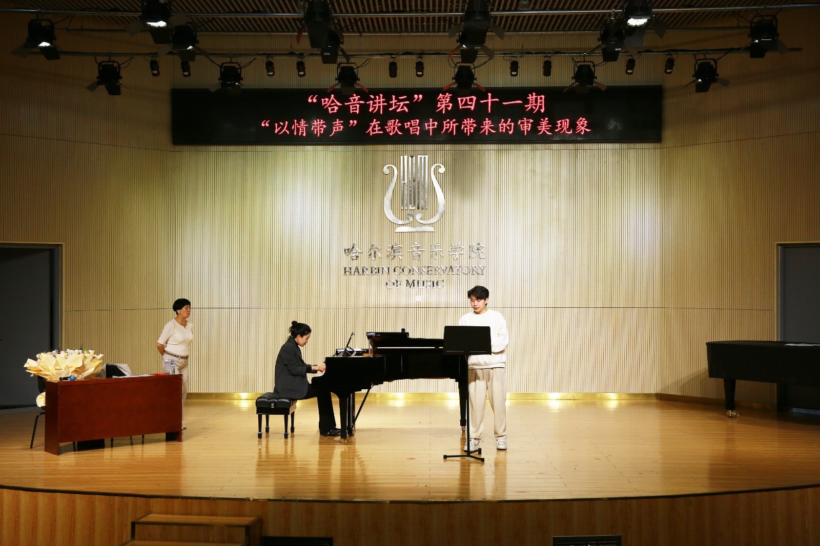 讲座中,陈其莲对声乐歌剧系师生代表的现场演唱进行了细致的点评。陈其莲指出,歌唱是用人声唱出人类感情,在歌唱艺术中最为感人的并不是声音,而是激发声音且蕴涵于声音之中的感情。惟有情动于衷发而为声,充满感情的演唱,才是最为感人的演唱;当人们的感情沉浸于歌唱的艺术创作之中时,以情带声则促使人们发出优美的声音去更完美地表现人类的感情。因此,无论是教师在教学中还是歌者在练习中,对歌唱声音的训练和对歌唱感情的培养都是同等重要的。