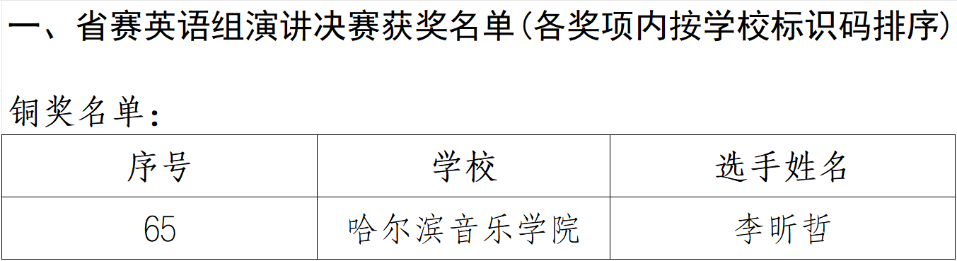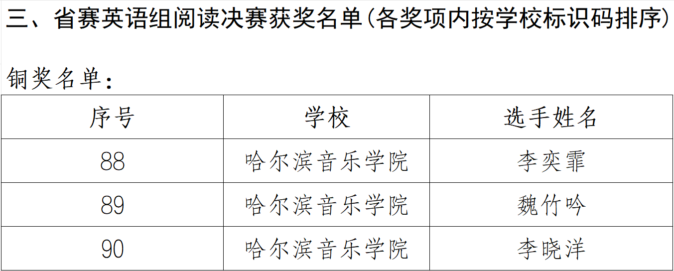 近日,省教育厅公布了2023年“理解当代中国”全国大学生外语能力大赛黑龙江省赛区获奖结果。学院共有4位学生在黑龙江省赛区决赛中获得佳绩,艺术学系2021级李昕哲获得省赛英语组演讲决赛铜奖,音乐学系2019级李晓洋、2021级魏竹吟、艺术学系2022级李奕霏获得省赛英语组阅读决赛铜奖。