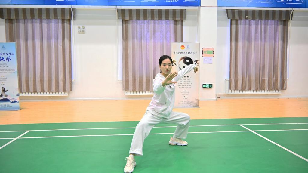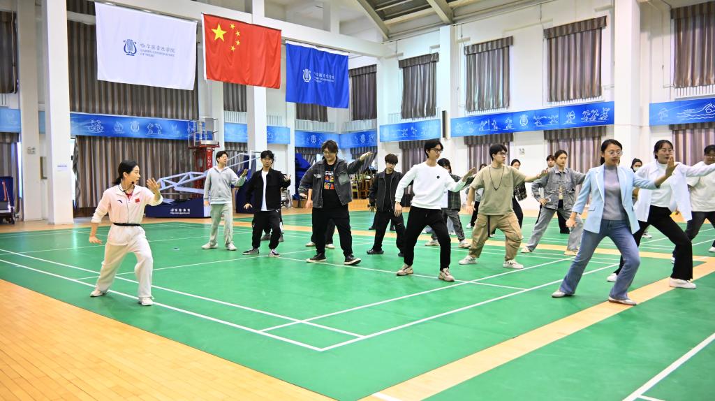 本次活动邀请了国家健将级运动员,中国武术协会会员,哈尔滨体育学院教师李甜甜,面向师生开展了太极八段锦实操训练。李老师将太极文化与音乐文化相结合,详细讲解了太极八段锦的基本原理、养生益处,并以声乐为例,指出学习歌唱和练太极拳的关键均在于“气沉丹田”,歌唱和太极对气追求的高层意境都是“以心行气,以气运身(声)”。随后,她逐一示范了太极拳的基本动作,用刚柔相济、快慢有节,行云流水般连绵不断的动作将太极神韵表现得淋漓尽致,现场掌声雷动。同学们积极与老师互动,询问动作要领和注意事项,活动现场气氛热烈。师生们在沉浸式体验传统体育项目与养生文化的同时,也进一步激发了大家对传统文化的兴趣和热情。