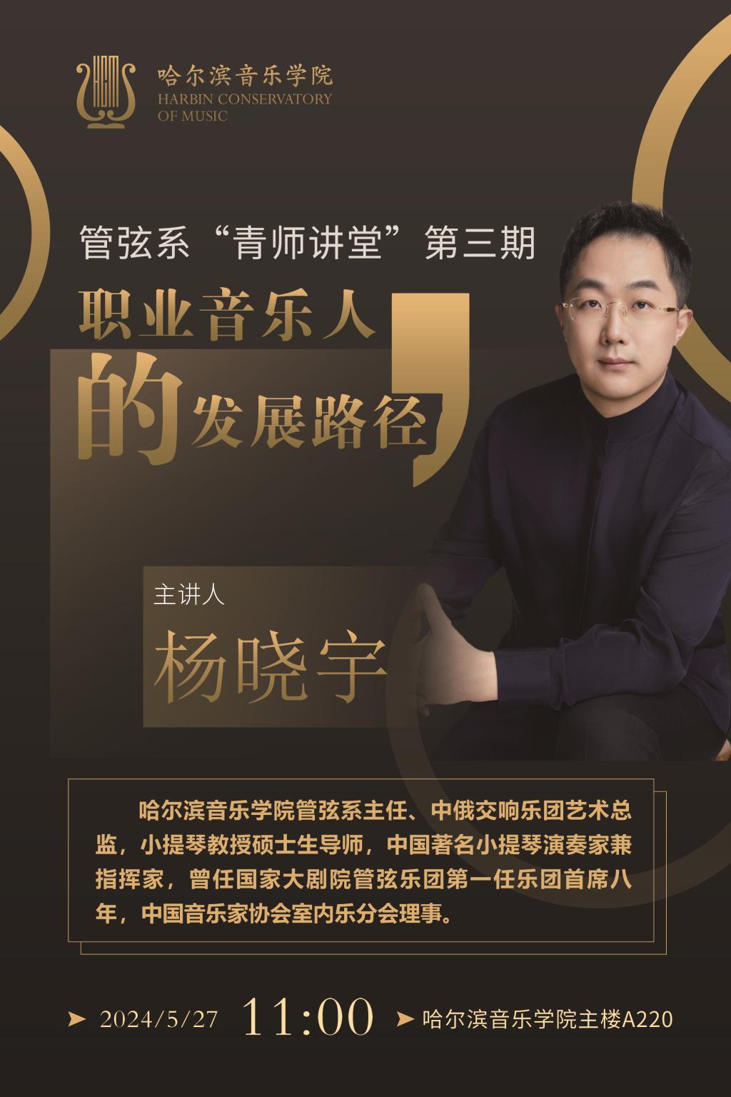 为了提高管弦系人才培养质量,提升学生专业技能,5月27日上午,管弦系在A220举办了题为《职业音乐人的发展路径》的专题讲座。此次讲座由管弦系主任杨晓宇教授担任主讲,管弦系党总支书记杨玲主持,管弦系全体师生参加了此次讲座。