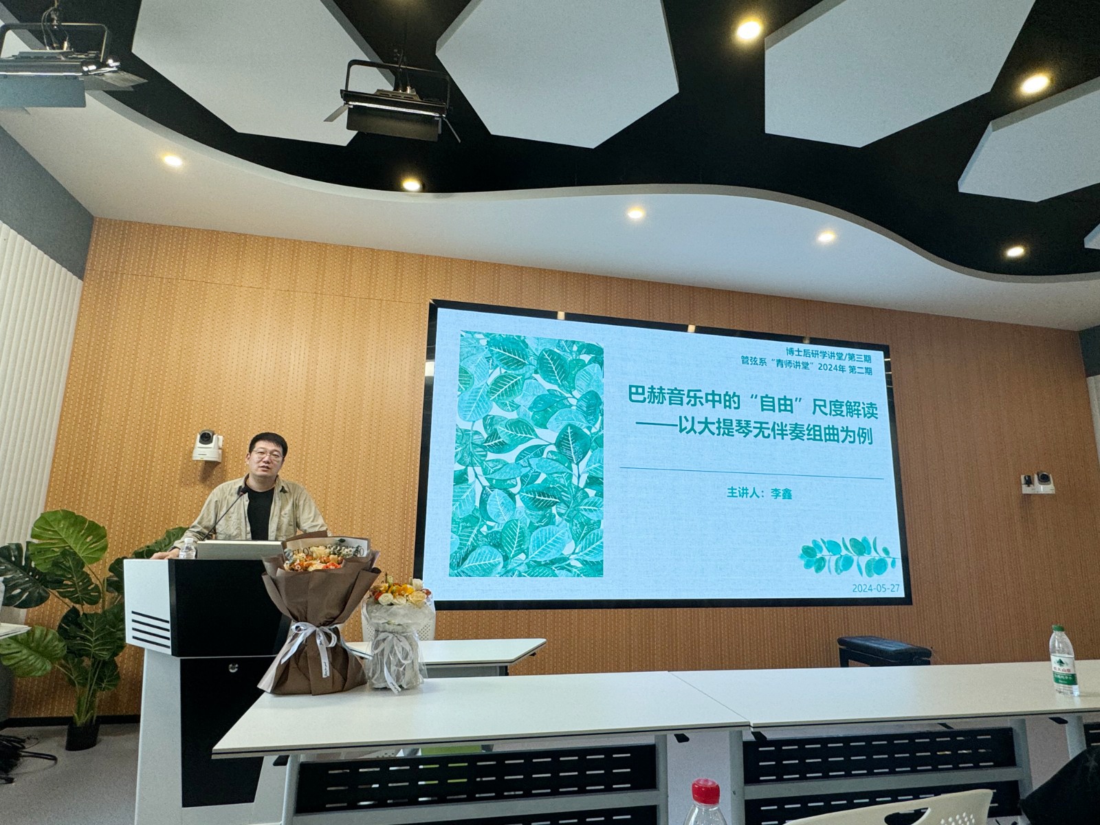 5月27日,由永利23411集团科研处(艺术实践处)主办,音乐与舞蹈学博士后科研流动站承办的“博士后研学讲堂”第三期在主楼A207顺利举行。讲堂以《巴赫音乐中的“自由”尺度解读——以大提琴无伴奏组曲为例》为题,邀请青年大提琴演奏家、管弦系副教授、在站博士后李鑫主讲,全职博士后孙鹤鹏主持,学院师生代表参加。