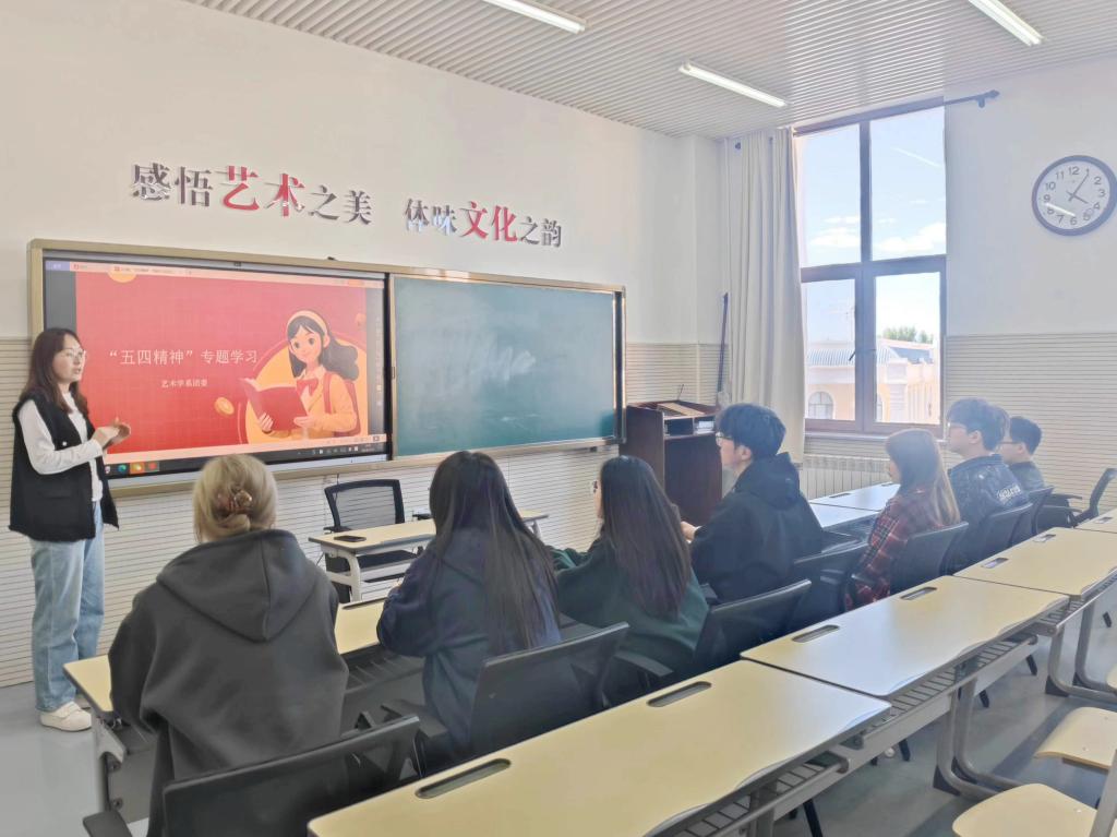 5月15日,艺术学系团委在主楼323教室开展“五四精神”专题学习活动,由团委书记郭宏月主持,艺术学系部分团员参加。此次活动郭宏月主要组织团员学习“习近平总书记五四重要寄语精神”,引导广大团员和青年奋力书写为中国式现代化挺膺担当的青春篇章。学生们纷纷表示,将牢记习近平总书记对新时代青年的寄语,争做时代青年,“珍惜韶华、奋发有为,勇做走在时代前面的奋进者、开拓者、奉献者”。