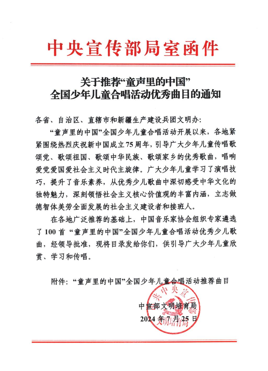 “童声里的中国”全国少年儿童合唱活动紧紧围绕热烈庆祝新中国成立75周年,引导广大少年儿童传唱歌颂党、歌颂祖国、歌颂中华民族、歌颂家乡的优秀歌曲,唱响爱党爱国爱社会主义时代主旋律。在各地广泛推荐的基础上,中国音乐家协会组织专家遴选了100首优秀作品。