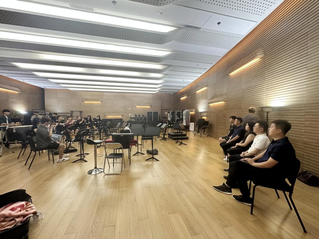 座谈会后,金韵吹打乐团的学生们向南京民族乐团的老师们展示了吹打作品《功夫》,双方面对面交流专业技巧和表演经验。随后,学院师生参观了南京民族乐团的排练场地、江苏大剧院的演出剧场等。