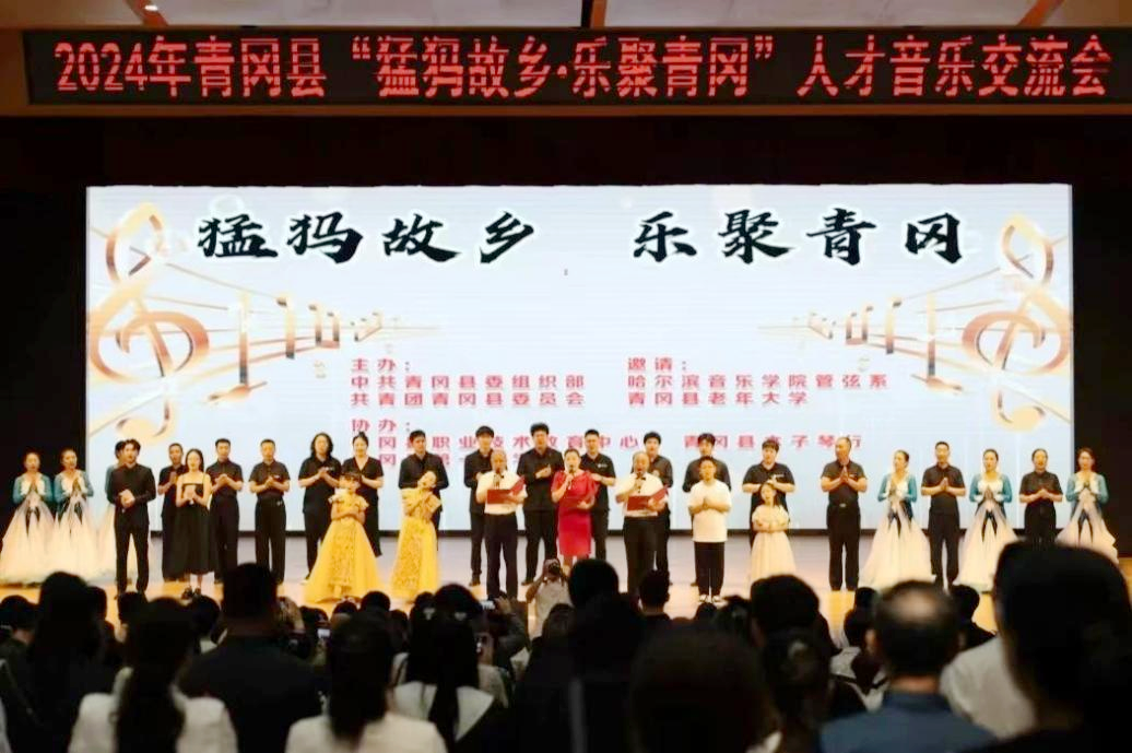 8月23日下午,在青冈县委组织部举办的2024年青冈县“猛犸故乡 乐聚青冈”人才音乐交流会上,管弦系师生志愿者们倾情演绎了《我和我的祖国》《红星歌》等多首经典音乐作品,用音乐宣扬优秀传统文化、红色革命精神。活动现场掌声不断,吸引全县各类人才以及青年学生共计600余人观看。