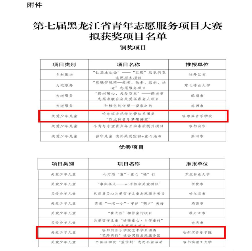 近日,由团省委、省青年志愿者协会举办的第七届黑龙江省青年志愿服务项目大赛获奖名单公布,学院推报的管弦系团委“四点钟音乐梦想讲堂”荣获铜奖,艺术学系团委“艺路前行”社会实践志愿服务团获评优秀项目。