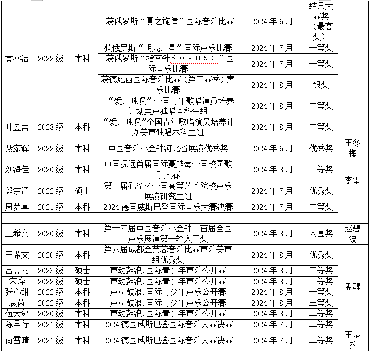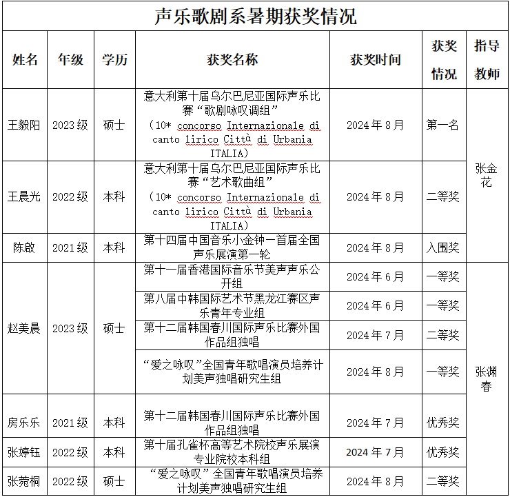 在刚刚过去的暑假,声乐歌剧系的学子们积极参与国内外各项重要声乐赛事,与众多优秀的声乐人才同台竞技,展现出了非凡的实力和风采,以卓越的表现和精湛的技艺为学院赢得了荣誉。