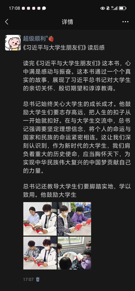9月4日下午,民族声乐系团委在致乐公寓102会议室开展“《习近平与大学生朋友们》第二卷”专题读书分享会活动。小组成员介绍了书籍的编写过程和读书的收获感悟,2023级本科生曲疏桐同学围绕学习习近平总书记重要寄语精神发表读后感,表示作为当代大学生要在中国式现代化进程中要挺膺担当,为实现中华民族伟大复兴贡献力量。