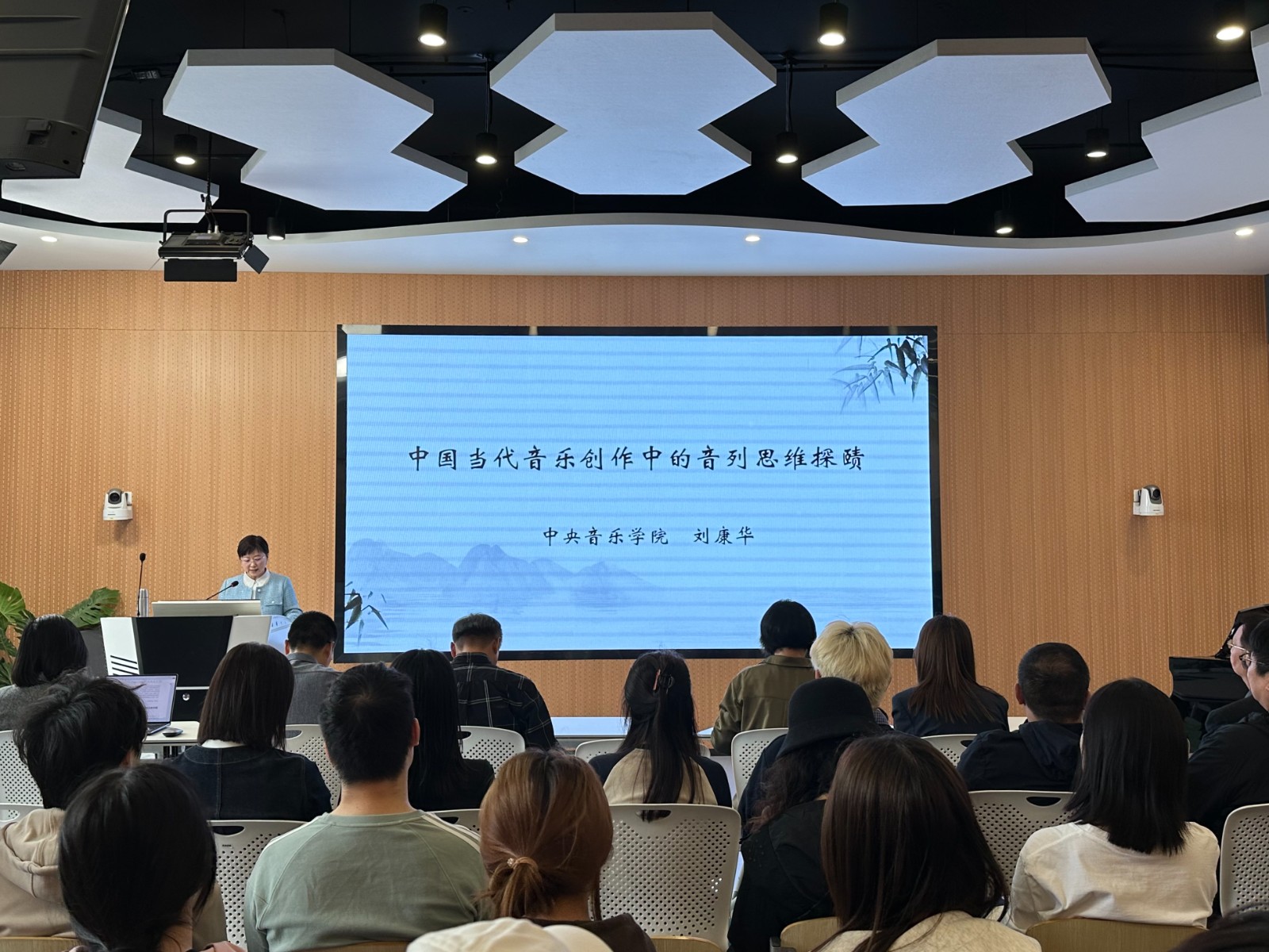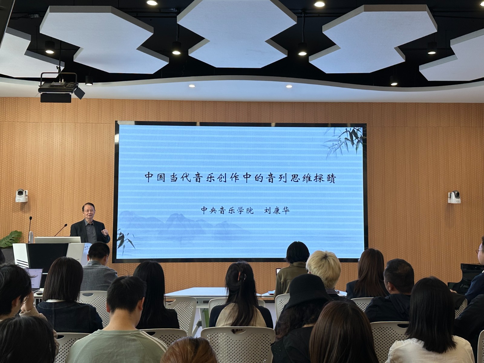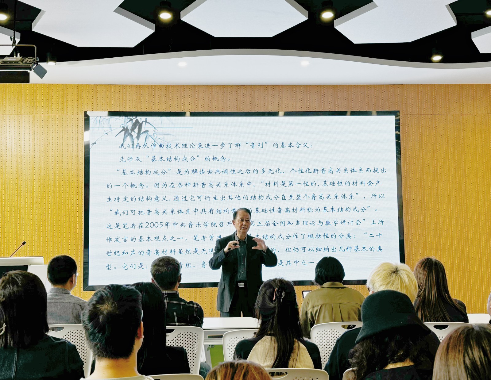 讲座上,刘康华从概念和作曲技术理论两方面向同学们解释了音列的基本含义,从而引入当和声突破以大小调体系为基础的调性和声之后,人们的创作思维会重新回归无“主次”之分与“级差”之别的音列而开启新的音高关系探索。讲座以沈葉的唢呐协奏曲《一枝花》、张千一的交响套曲《我的祖国》第四乐章《春到边寨》为例,指出虽然这些作品在创作观念、精神内涵、表现内容、写作技法等方面各具特色,个性鲜明,但在音高组织思维方面,即结构的深层次仍表现出某种可加以探讨的共性问题——音列思维。