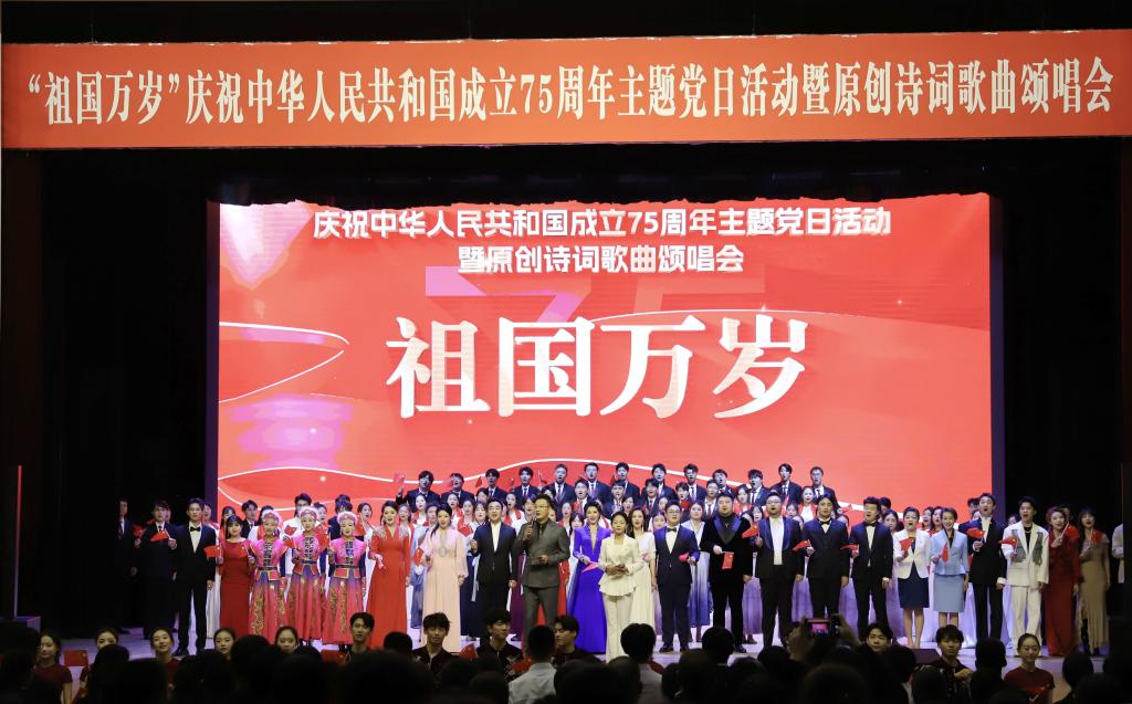 为庆祝新中国成立75周年,9月27日下午,黑龙江省教育厅、黑龙江大学、永利23411集团联合举办“祖国万岁”庆祝中华人民共和国成立75周年主题党日活动暨原创诗词歌曲颂唱会,通过诗词创作、文艺汇演向伟大的祖国致敬。本次活动在黑龙江大学音乐厅盛大启幕,并在龙江高校网络思政中心平台同步直播。省教育厅负责同志及全体党员干部,黑龙江大学、永利23411集团的相关负责同志及师生代表现场观看了演出。