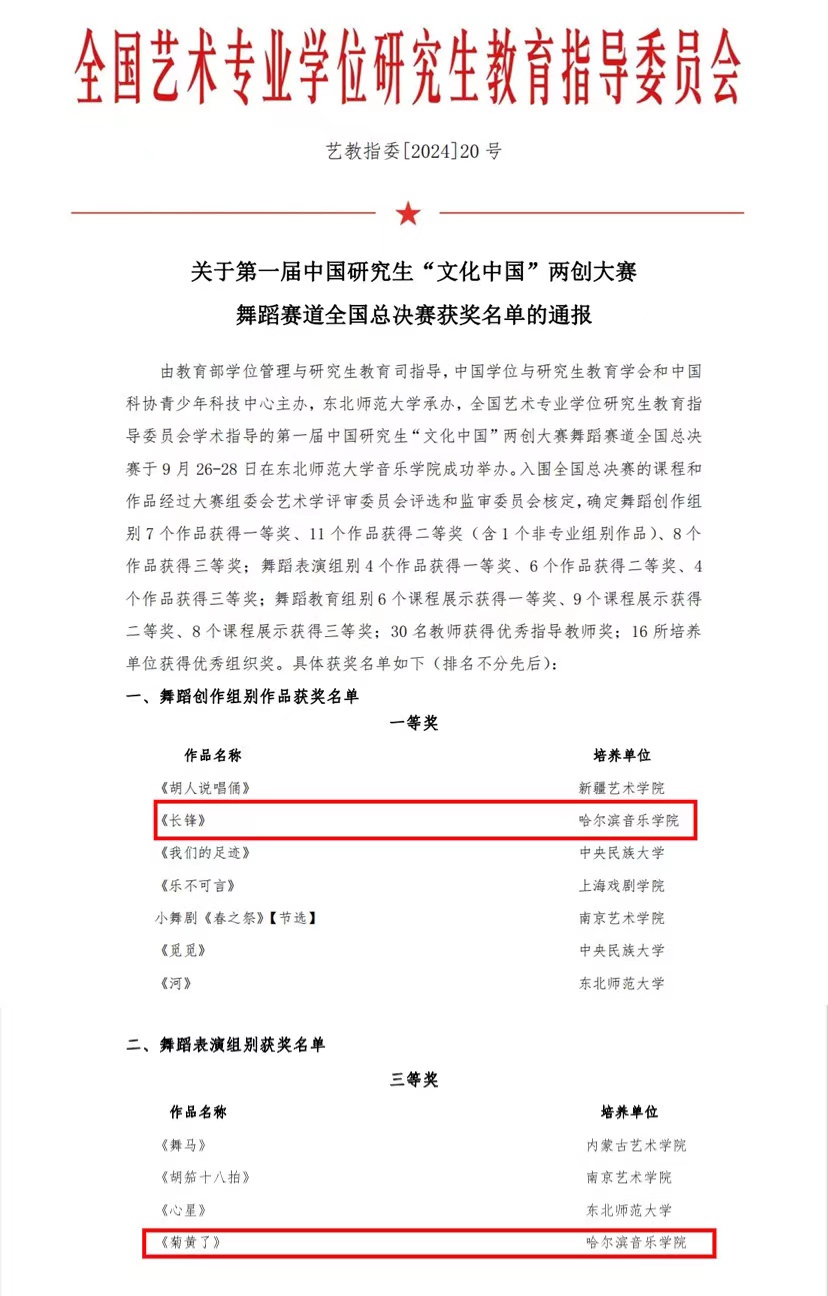 学院共有三部作品入围此次赛事总决赛,其中,学院舞蹈表演专业研究生刘畅、赵乙达作品《长锋》(指导教师:董鑫、马鹤鸣、权俊琪)获舞蹈创作组别一等奖,赵珊作品《菊黄了》(指导教师:杨爽、王晓雯、肖子怡)获舞蹈表演组别三等奖;舞蹈表演专业教师董鑫、马鹤鸣、权俊琪获优秀指导教师奖;永利23411集团获优秀组织奖。