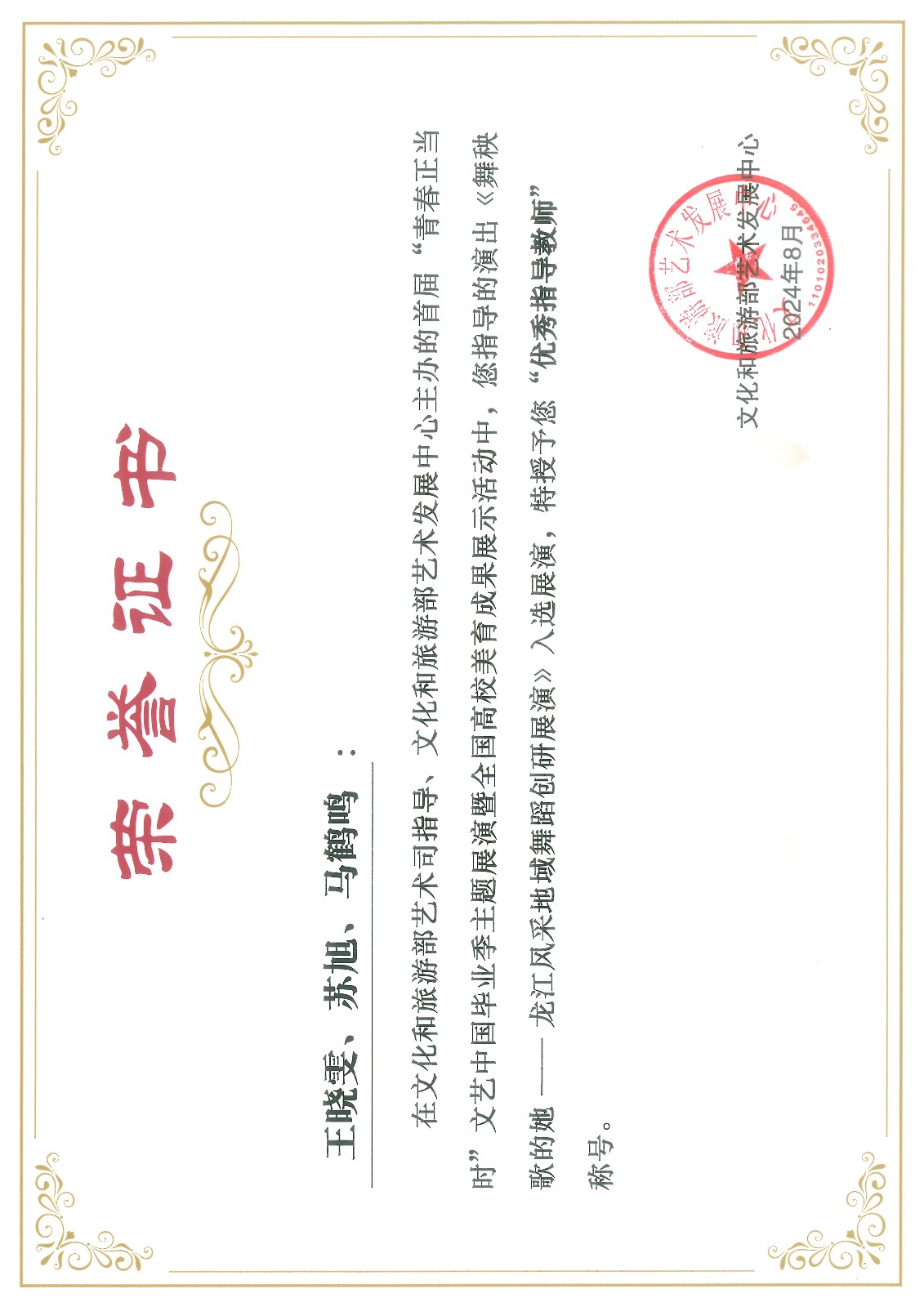 《舞秧歌的她——龙江风采地域舞蹈创研展演》(指导教师:董鑫、杨爽、王晓雯、苏旭、马鹤鸣)通过“她”在一条曲折的路上的思绪沉浸回忆展开,通过空中飞舞的手绢,展现“她”的艺术财富和艺术生命的延续,刻画出跳秧歌,教秧歌,一生舞秧歌的心路历程,以致敬老艺术家不忘初心、持之以恒的不渝信念。