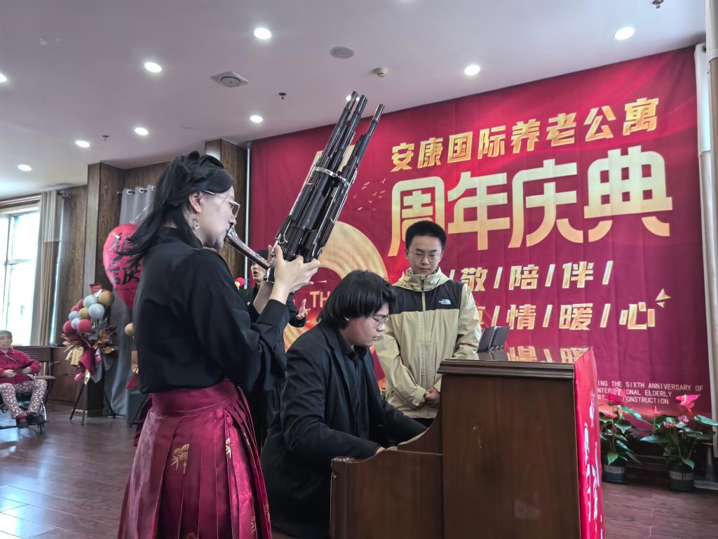 为弘扬中华民族团结友爱、敬老爱老的传统美德,在民族团结进步宣传月,在辅导员齐道喜、王丹阳和陈怡霖的带领下,民乐钢琴联合团委组织少数民族学生和共青团员,于10月30日走进安康国际养老公寓,开展“爱老敬老,情暖金秋”志愿服务活动。