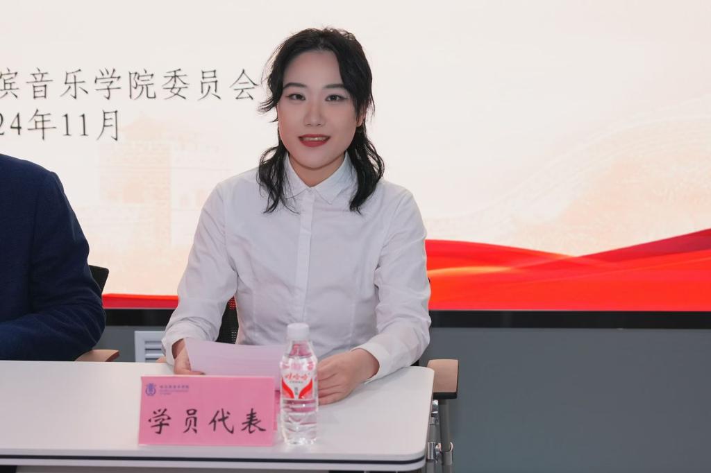 2022级艺术学系研究生陈泽熹代表优秀学员发言,向全体学员分享了个人学习心得。她表示,一年的集中学习和参访实践活动,使她提升了理论素养、开阔了眼界视野、坚定了理想信念。她呼吁全体学员以实际行动践行承诺,发扬“青马”精神,携手同行,不断追求卓越,不断超越自我。