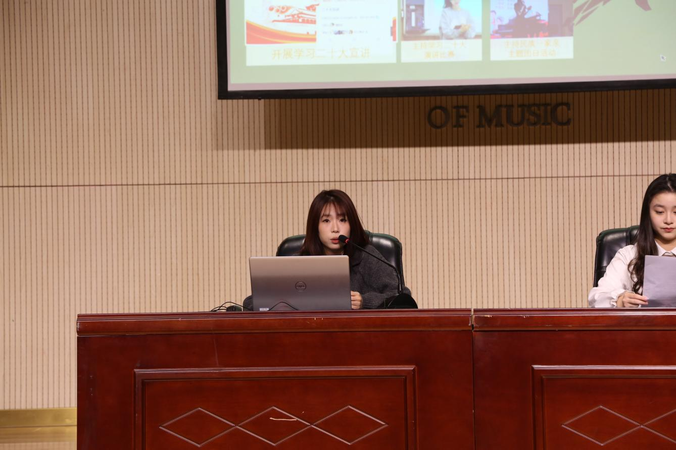 民族声乐系2021级本科生周璇以“知行合一 不负韶华”为主题,从锤炼党性、悟得其实、志愿服务三个方面展开宣讲,勉励同学们在未来的学习生活中,勇敢接触自己从未接触过的新知识、新课程。