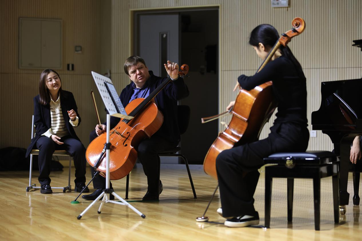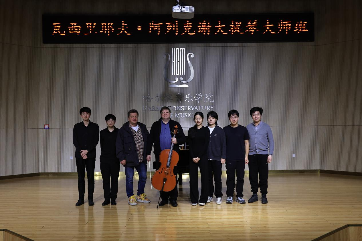 在俄罗斯圣彼得堡国立音乐学院院长、大提琴教授、俄罗斯功勋演奏员阿列克谢·瓦西里耶夫主讲的大提琴大师班上,学院管弦系三名学生分别演奏了肖斯塔科维奇《降E大调大提琴协奏曲》的第一乐章、海顿C大调大提琴协奏曲的第一乐章、埃尔加e小调大提琴协奏曲的第一乐章。瓦西里耶夫·阿列克谢对学生们的演奏进行了详细的点评,指导同学们在连贯的乐句中注意每个音的揉弦频率和幅度保持一致,降低左手的紧张感以追求更好的演奏状态。