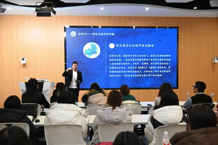 民乐系教师党支部徐鑫以《大同乐会当中的几位琵琶艺术家》为题,向大家介绍了大同乐会历史长河中数位杰出琵琶艺术家的卓越风采与独特贡献,从他们精湛的演奏技艺到对琵琶艺术传承发展的坚守,生动展现了琵琶艺术在特定文化语境下的多元魅力与深厚底蕴,让在场听众深切感受到传统琵琶文化的博大精深。