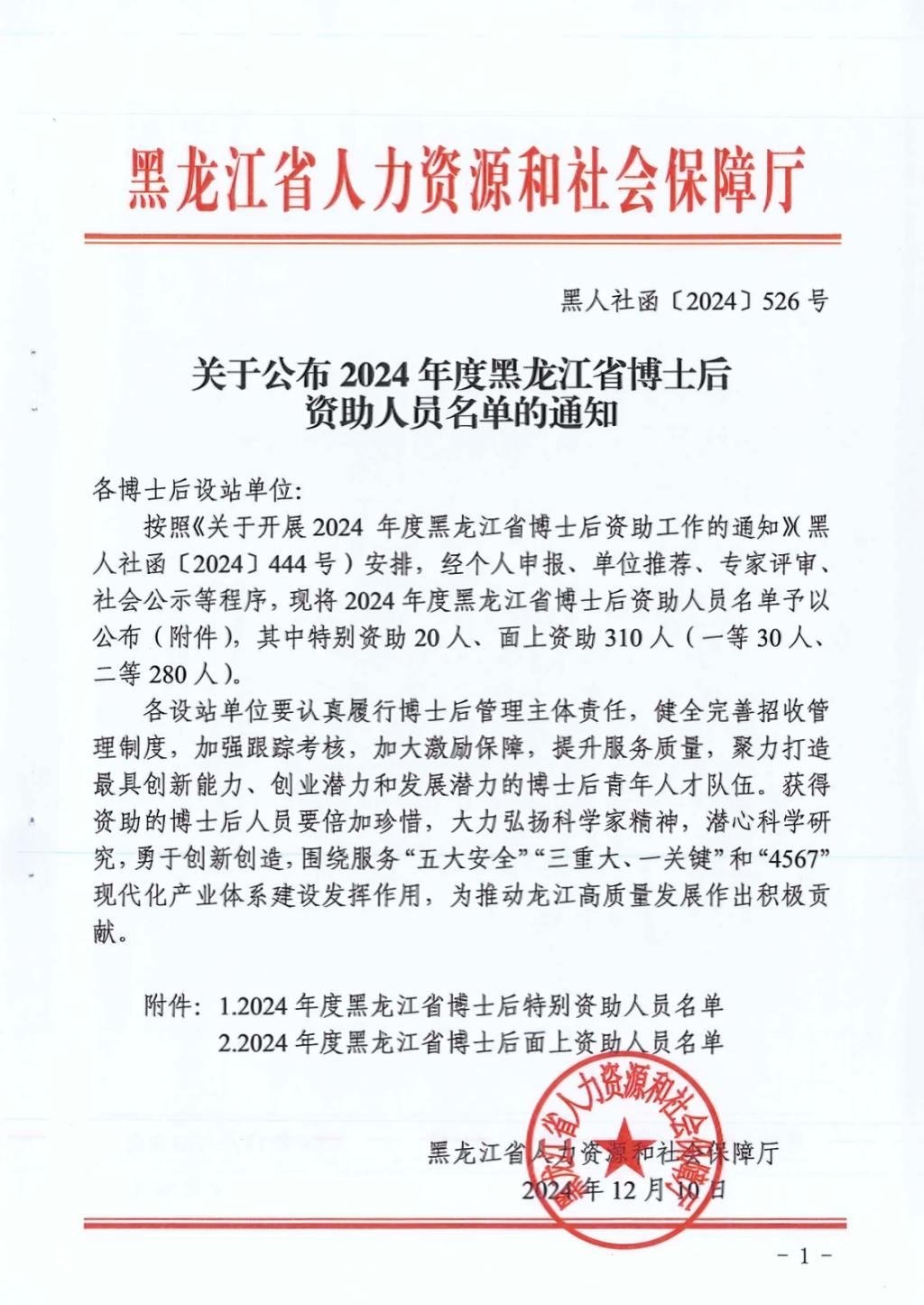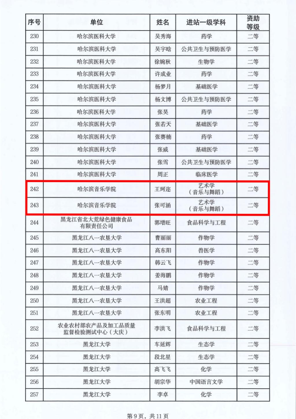 近日,黑龙江省人力资源和社会保障厅下发《关于公布2024年度黑龙江省博士后资助人员名单的通知》(黑人社函〔2024〕526号)。学院音乐与舞蹈学博士后张可涵、王珂迩获得2024年度博士后面上资助项目二等资助,资助金额20万元。这是学院建立博士后科研流动站以来首次获得两项面上资助项目。