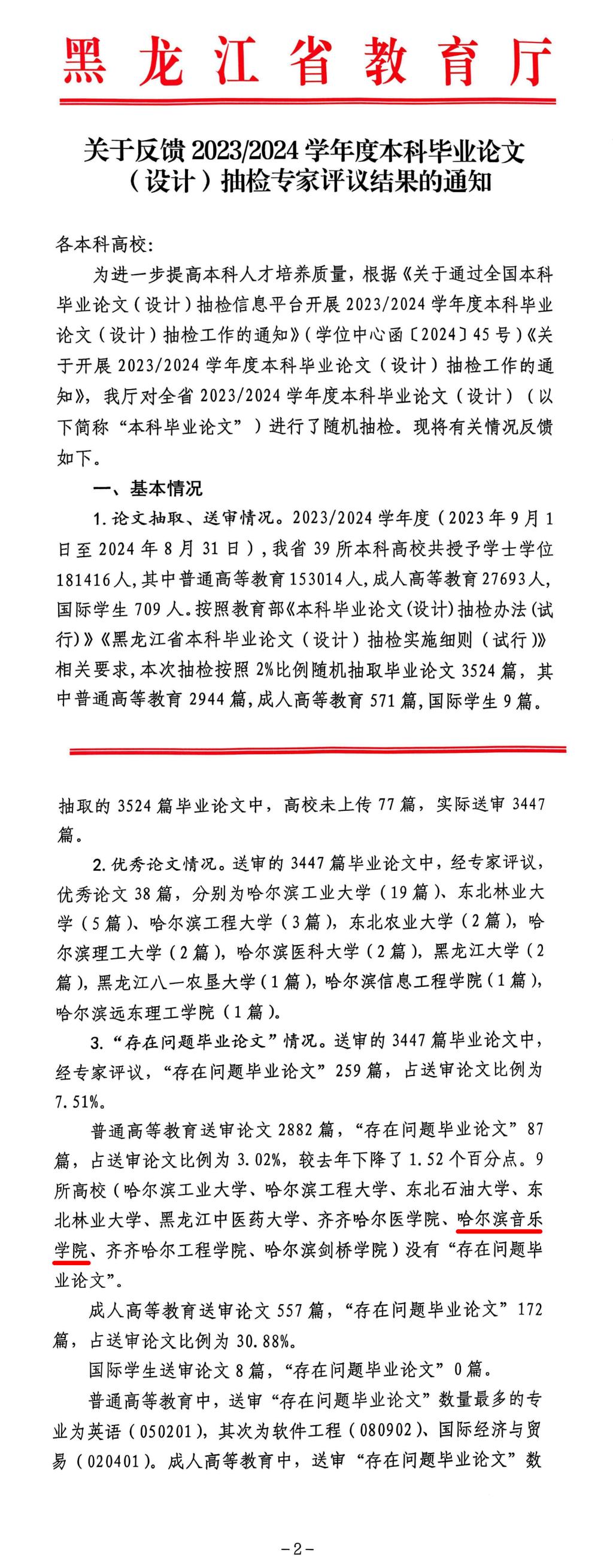 近日,黑龙江教育厅下发了《关于反馈2023/2024学年度本科毕业论文(设计)抽检评议结果的通知》,学院按要求送审的论文在此次抽检中全部合格。这是自2022年教育部开展本科毕业论文(设计)抽检工作以来,学院本科生毕业论文连续三年保持抽检合格率为100%!