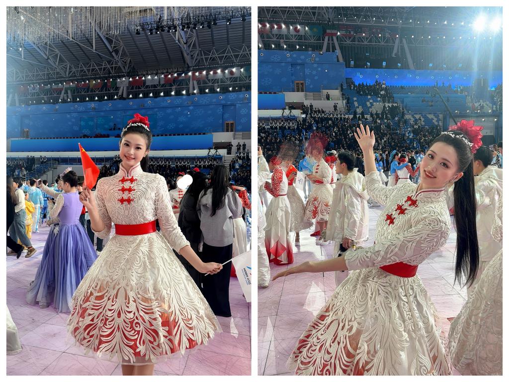 在亚冬会开闭幕式引导员的队伍中,声乐歌剧系2021级本科生房乐乐的身影格外引人注目。作为引导员之一,她不仅用优雅的姿态和自信的笑容完成了任务,更用音乐学子的独特气质为这场冰雪盛会增添了一抹艺术色彩。