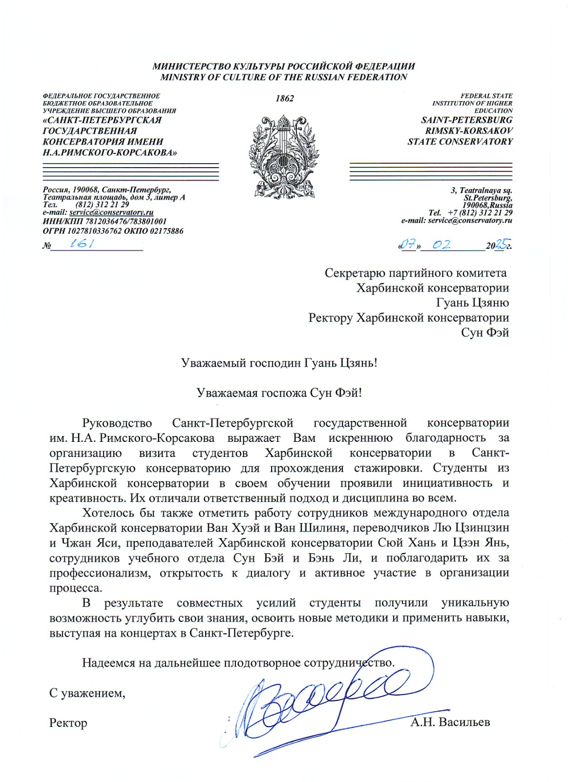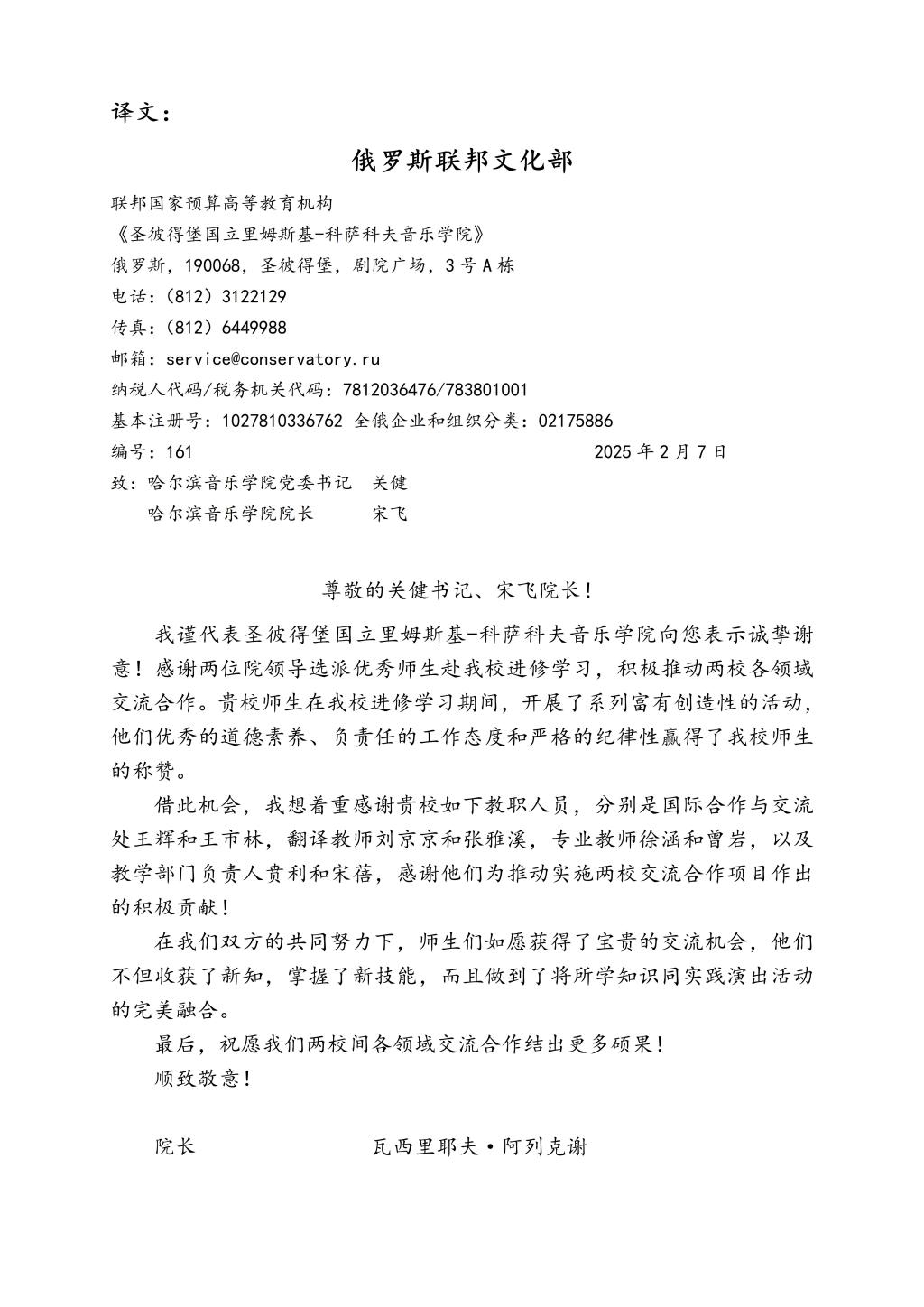 近日,学院收到了来自圣彼得堡音乐学院瓦西里耶夫院长的感谢信,对学院领导、师生选派优秀师生赴圣音进修学习,积极推动两校各领域交流合作表示感谢,并表达了进一步加强合作的期望。纸短情长,这封跨越千里的感谢信,不仅是对学院对俄合作办学成果的充分肯定,更是两所高等音乐学府深厚友谊的见证。