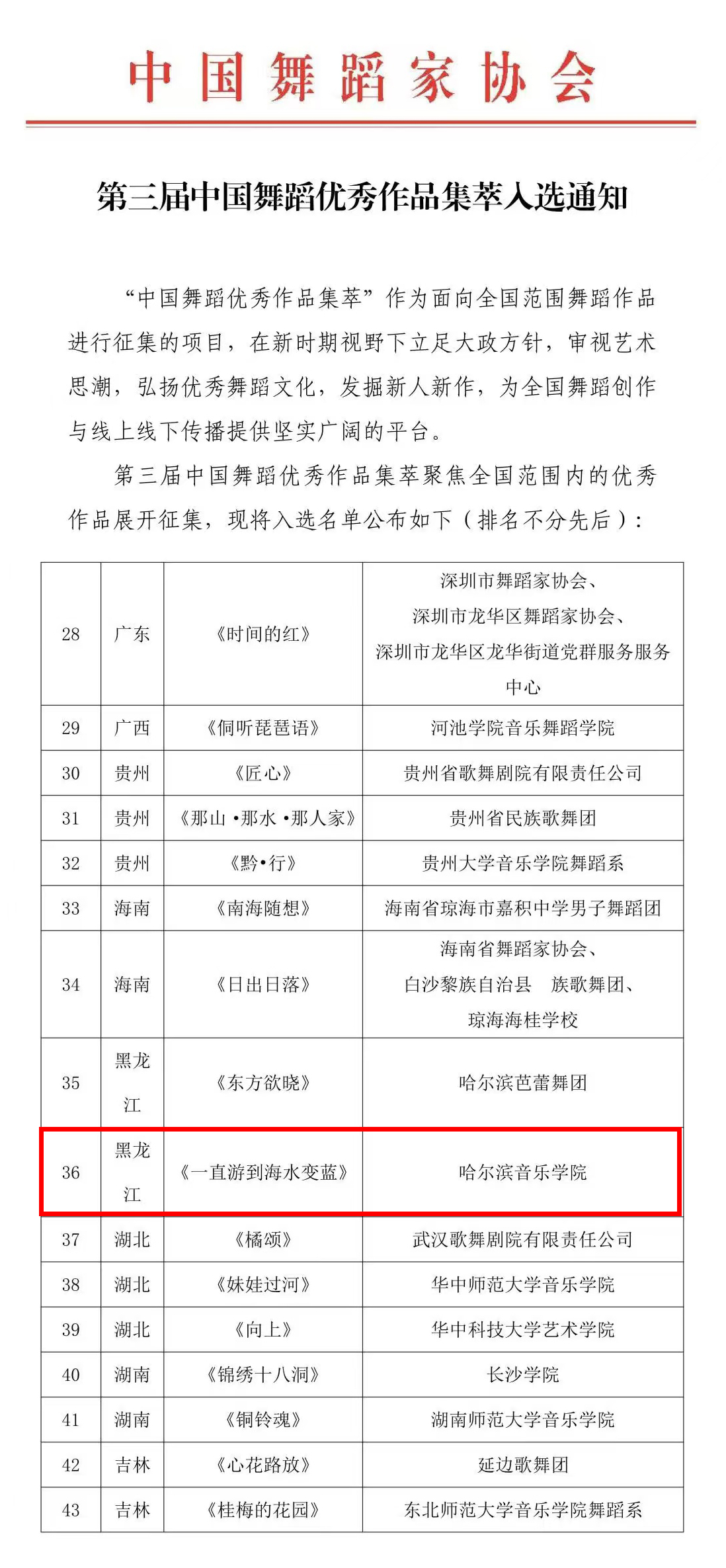 近日,中国舞蹈家协会公布“第三届中国舞蹈优秀作品集萃”入选结果,全国共有77件舞蹈作品入选。学院舞蹈表演专业原创现代舞《一直游到海水变蓝》成功入选。