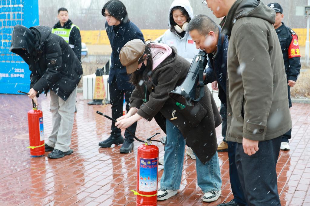 演练环节现场模拟了学生公寓突发火情。在火灾探测器报警后,消防控制室立即联动公寓核实,确认火情启动应急预案,通信联络组、疏散引导组、灭火行动组迅速响应,灭火组身着防护服快速扑灭初起火灾,全体师生仅用4分钟便安全撤离至广场。随后,工作人员现场讲解干粉灭火器使用方法,学生纷纷踊跃报名,亲自上手进行实操体验。