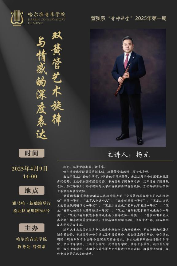 4月9日下午,学院管弦系“青师讲堂”系列活动之“双簧管艺术旋律与情感的深度表达”讲座式音乐会在哈尔滨市道里区雅马哈·新瑞海琴行演奏厅成功举办。本次讲座音乐会由学院管弦系副主任杨光担任主讲,管弦系双簧管乐团演奏,以其独特的形式吸引了众多音乐爱好者和专业人士前来聆听。