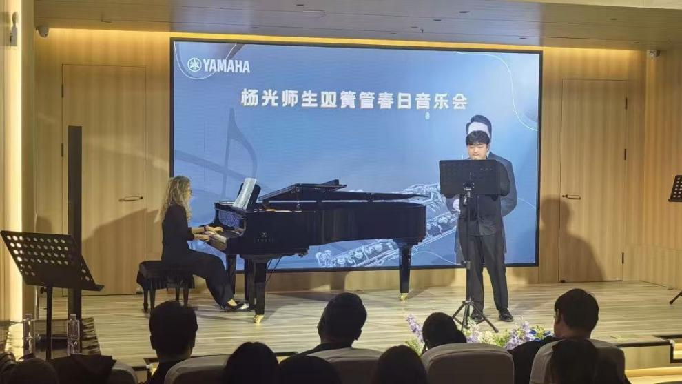 音乐会上,杨光携手双簧管专业教师陈利宇、俄籍艺术指导教师维罗妮卡和双簧管专业学生共同演绎了《F大调双簧管协奏曲》《沙龙之乐》《双簧管与钢琴奏鸣曲》等多首双簧管经典乐曲,旋律如潺潺溪流,灵动而富有诗意,双簧管的音色纯净而温暖,在演奏者的指尖与气息间流淌,每一个音符都仿佛被赋予了生命,诉说着古老而动人的故事。演奏者们精湛的技艺与默契的配合,将乐曲中的情感层次展现得淋漓尽致,时而激昂澎湃,时而舒缓悠扬,让观众仿佛置身于一场梦幻般的音乐之旅。