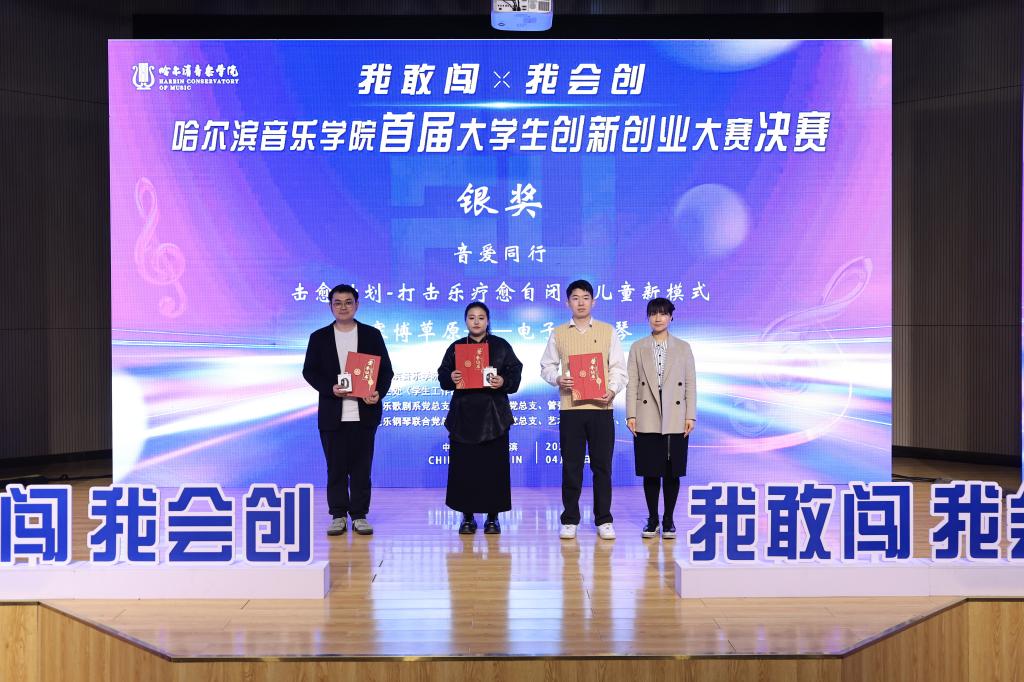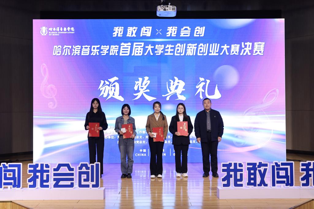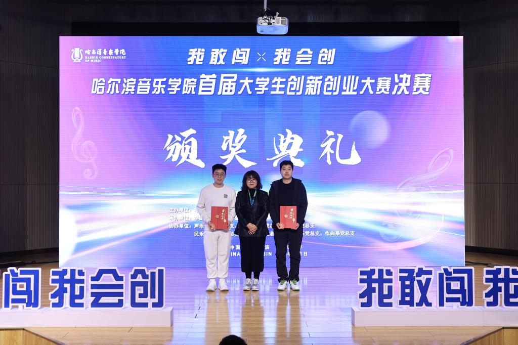 黑龙江工程学院创新创业中心主任赵晨光为铜奖作品《音旅定制——大学生音乐旅游盲盒设计与建设平台》《“五音和鸣”——打造中国传统民族音乐保护开发新平台》《“布遗鱼力·鱼皮造物工坊”——互联网赋能非遗发展新空间》《冰城弦韵:哈尔滨民族室内乐团“华夏篇章”创新实践》颁奖。