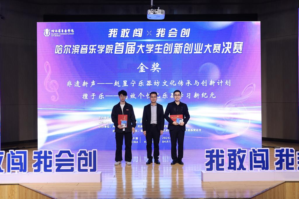 哈尔滨商业大学校长助理欧忠辉为金奖作品《非遗新声——赵昱宁乐器坊文化传承与创新计划》《擅于乐——高校个性化乐器学习新纪元》颁奖;