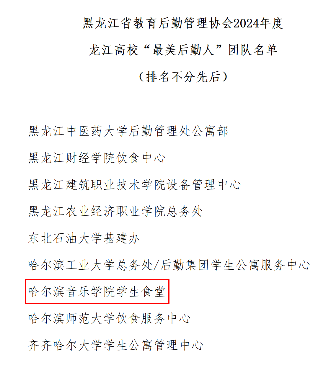 近日,由黑龙江省教育后勤管理协会组织开展以“教育强国 育人有我”为主题的“2024年度最美后勤人”活动落下帷幕。经高校推荐提名、评审委员会专家初评、参评人现场展示、评审委员会审定等环节层层筛选,学院食堂荣获2024年度龙江高校“最美后勤人”团队称号。