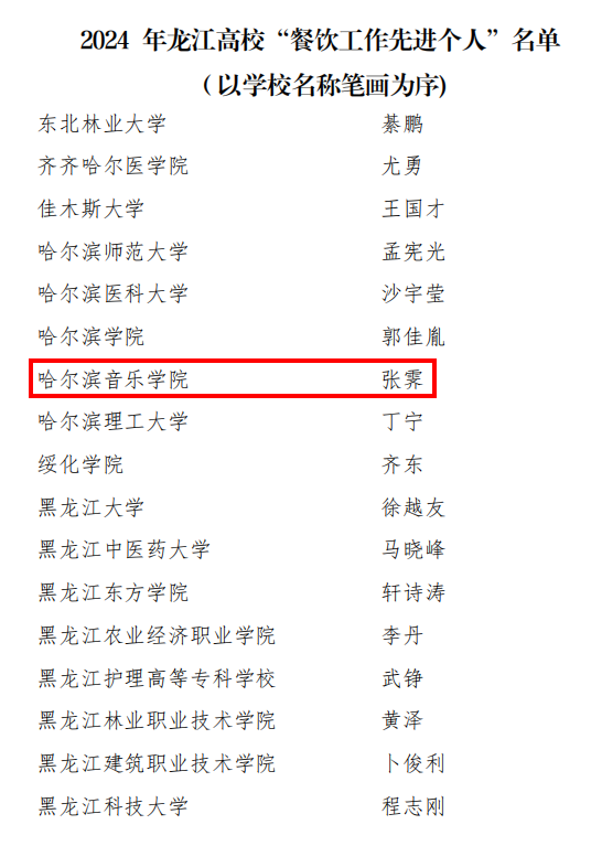 学院餐饮服务工作受到全院师生的广泛认可,得到省纪委监委肯定,特色举措被新华社等媒体专题报道,餐饮负责人张霁荣获2024年龙江高校“餐饮工作先进个人”荣誉称号。