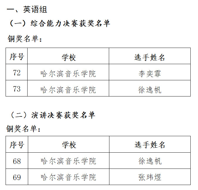 近日,省教育厅公布了2024年“外研社·国才杯”“理解当代中国”全国外语能力大赛黑龙江省赛区获奖结果,学院学生在比赛中表现出色、成绩优异。其中,艺术学系2022级李奕霏、民族声乐系2023级徐逸帆获得英语组综合能力决赛铜奖,民族声乐系2023级徐逸帆、2024级张玮煜获得英语组演讲决赛铜奖。