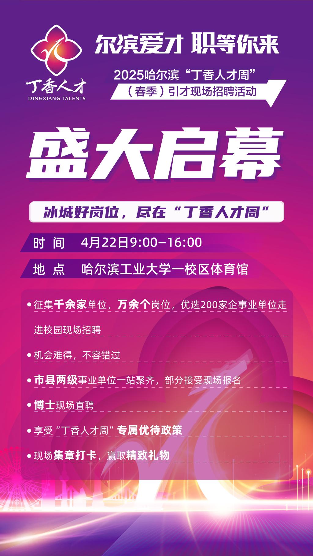 为助力人才发展与就业对接,2025年哈尔滨“丁香人才周”(春季)引才现场招聘活动将于4月22日9:00-16:00在哈尔滨工业大学一校区体育馆隆重启动。