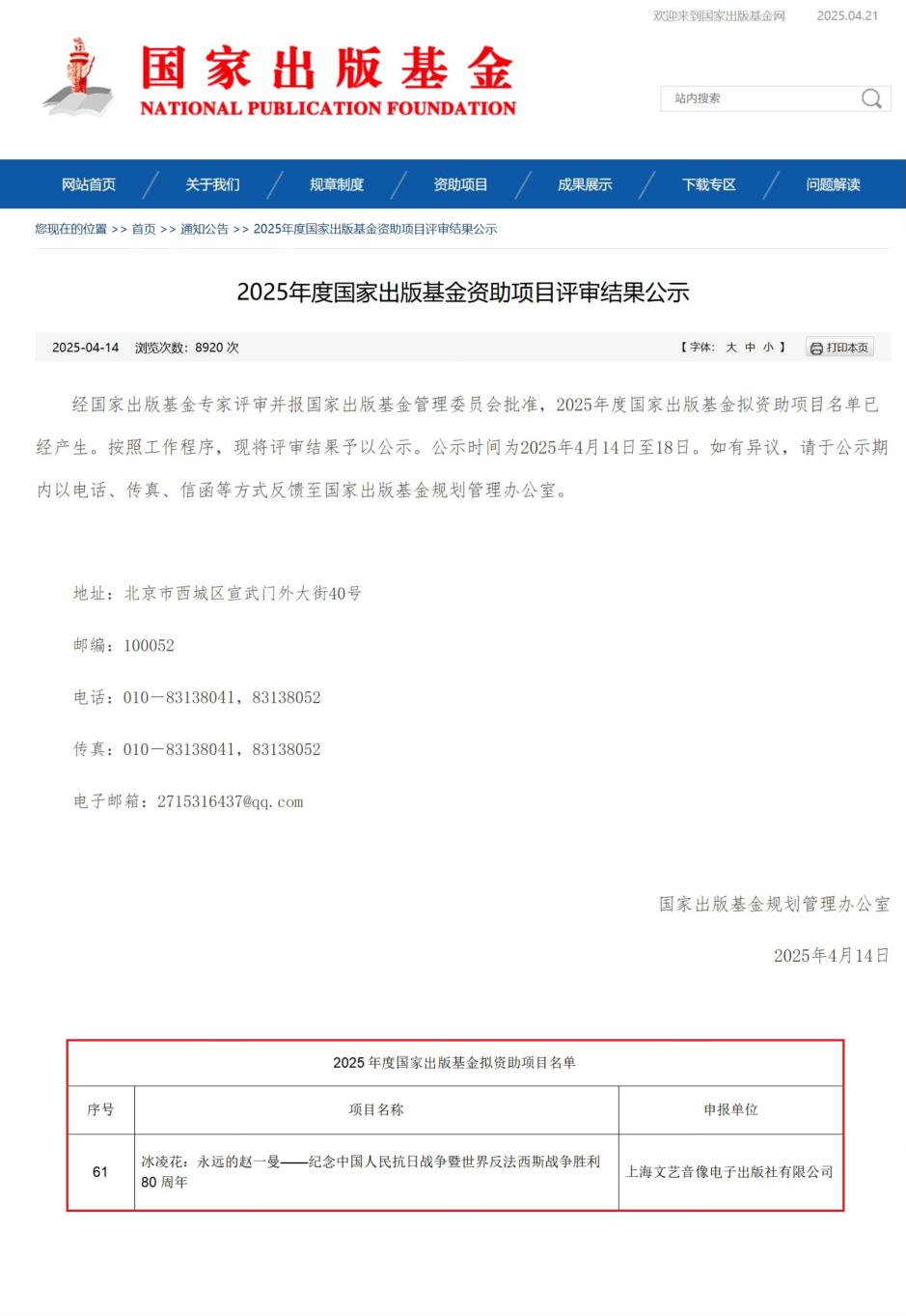 近日,国家出版基金规划管理办公室公示了2025年度国家出版基金资助项目名单,学院原创音乐作品《冰凌花:永远的赵一曼——纪念中国人民抗日战争暨反法西斯战争胜利80周年》(上海文艺音像电子出版社有限公司出版)成功获批。这是学院首次获批国家出版基金项目。