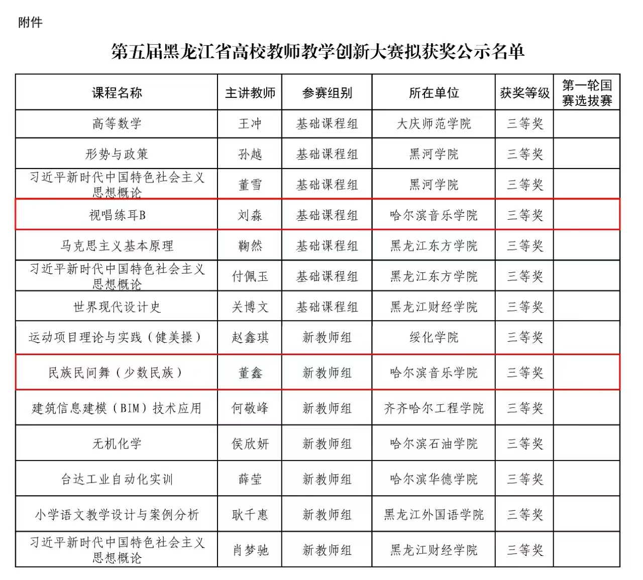 近日,第五届全国高校教师教学创新大赛(黑龙江赛区)比赛结果公布。经过激烈角逐,学院作曲系教师刘淼荣获基础课中级及以下组三等奖,管弦系舞蹈表演专业教师董鑫荣获新教师组三等奖,展现了学院教师队伍的教学风采与创新实力。