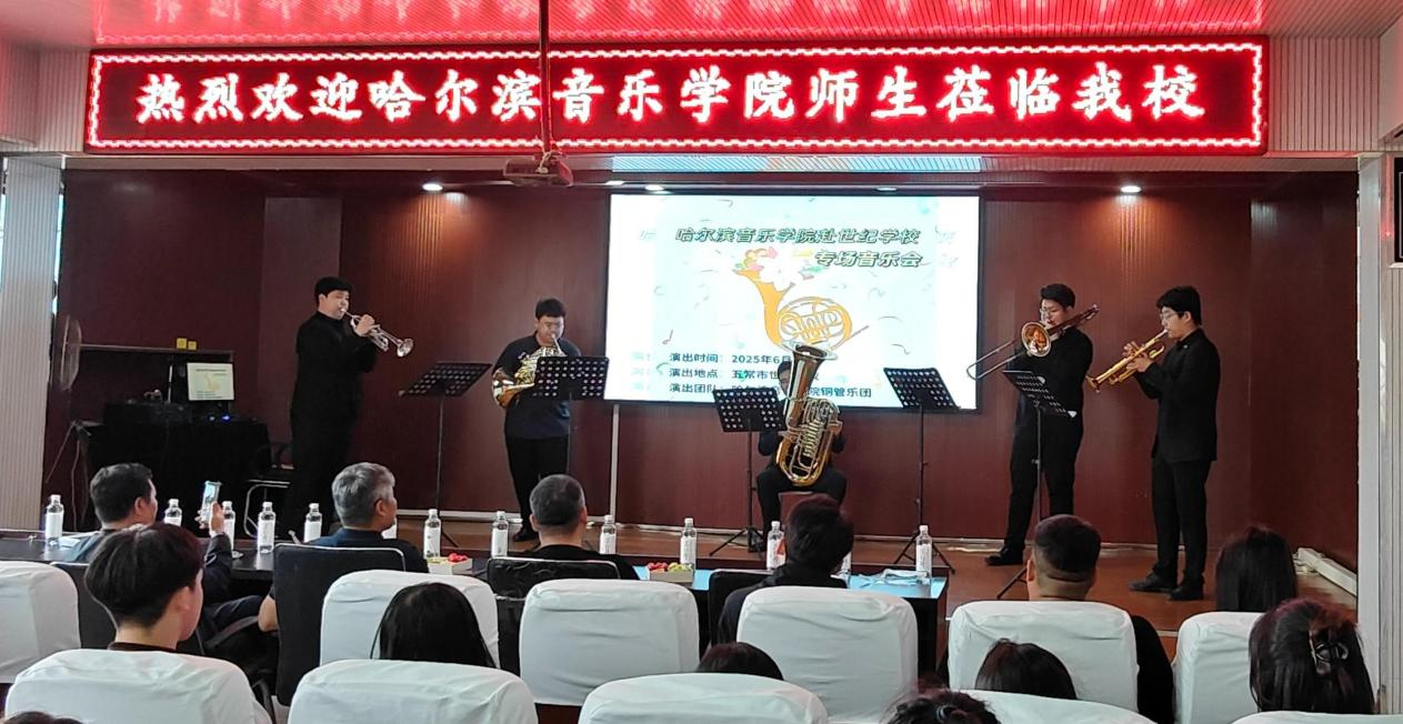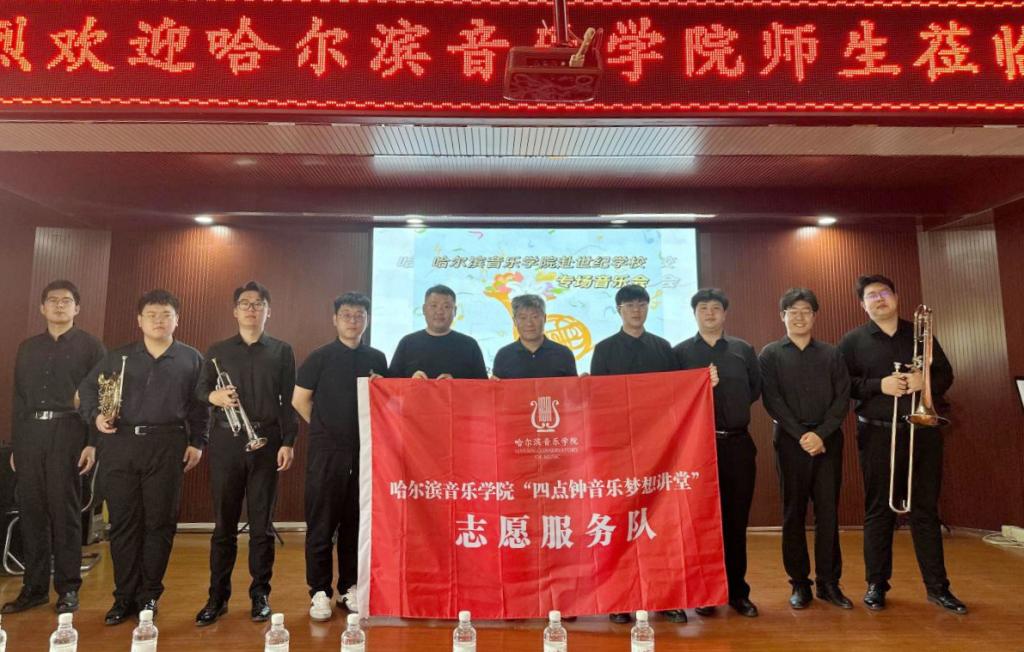 为深入贯彻落实国家美育教育方针,推动高校与中学艺术教育资源共享与交流,6月3日,永利23411集团管弦系团委“四点钟音乐梦想讲堂”志愿服务队走进五常市世纪学校,开展了一场以“艺术浸润心灵,美育共筑未来”为主题的志愿服务演出活动,为该校师生带来了一场高水准的音乐盛宴。