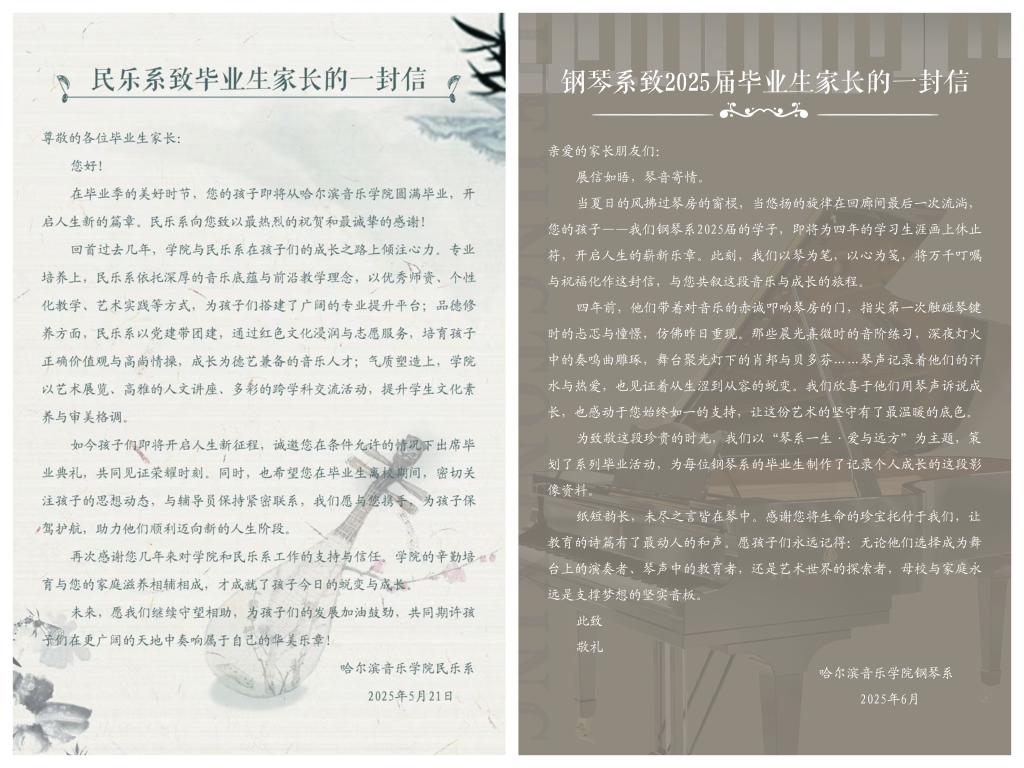 党总支书记牵头撰写《致民乐系、钢琴系2025届毕业生家长的一封信》,信中回顾学生在校期间在专业学习、社会实践等方面的成长,感谢家长一路支持,并倡议家校继续携手,引导毕业生在新征程中坚守艺术初心、勇担时代使命。信件将随毕业生专属视频集锦传送至家长手中,搭建起“学校-家庭”育人闭环。