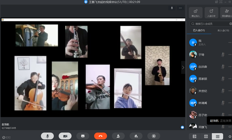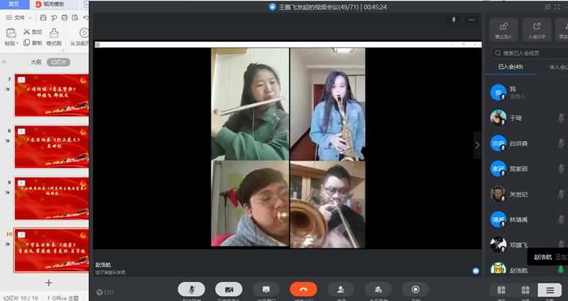 主题团日活动在《光荣啊,中国共青团》中正式开始,王鹏飞老师带领在线师生回顾了近两年管弦团委开展的主题音乐党课、主题团活、主题社会实践等活动,以及所取得的荣誉,通过视频展示了管弦系青年学生在抗击新冠肺炎疫情中的责任与担当,他们或是投身社区抗疫工作,或是通过录制云合奏视频,向抗疫一线工作者表达最诚挚的敬意和祝愿。