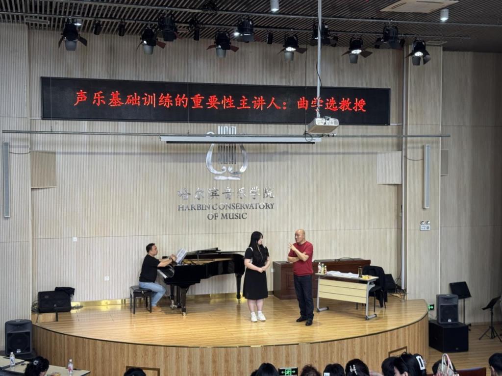 他提到,语言是声乐区别于其他乐器的唯一因素,声音造就不了乐感,语言语气造就演唱者的乐感,所以歌唱中要有抑扬顿挫。曲教授指出,在演唱高音时,高音区声音不要散,声音应该像金字塔一样,越到高音越集中。演唱要尊重创作者,要理解歌词的含义,强弱的处理要符合音乐情绪。演唱歌剧时要唱人物,人物的把握是歌剧的灵魂。