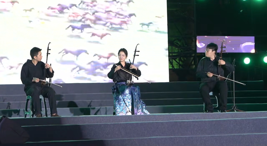 演出在气势磅礴的《龙腾虎跃》中震撼开场,激昂的鼓点瞬间点燃全场氛围;二胡独奏《红军哥哥回来了》以深情婉转的旋律,再现军民鱼水情深的动人故事;琵琶古曲《十面埋伏》再现楚汉争霸的壮烈场景;古筝独奏《行者》带领观众穿越千年丝路,感受大漠孤烟的苍茫与悠远;唢呐独奏《望平川》展现西北苍茫;竹笛齐奏《扬鞭催马运粮忙》以欢快热烈的节奏,展现劳动人民丰收的喜悦;二胡齐奏《新赛马》以奔腾不息的旋律,传递出昂扬向上的精神风貌;吹打乐《将军令》以恢宏的气势将演出推向高潮,赢得观众经久不息的掌声。