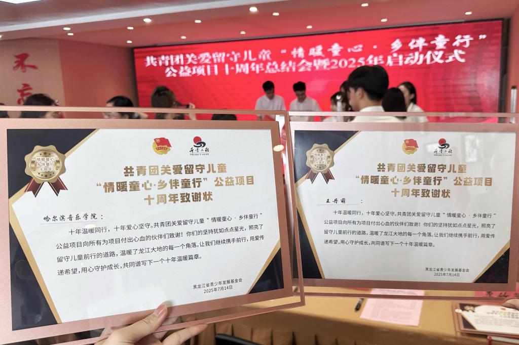 7月14日,由共青团黑龙江省委员会指导,黑龙江省希望工程捐助中心、黑龙江省青少年发展基金会主办的共青团关爱留守儿童“情暖童心・乡伴童行”公益项目十周年总结会暨2025年启动仪式在希望大厦圆满举行。民乐钢琴联合团委书记王丹阳作为高校教师代表,民乐系学生王丹萌、张艺佳、王禹杰作为志愿者代表线下参会,学院在项目中的深耕与成果获得现场广泛关注。
