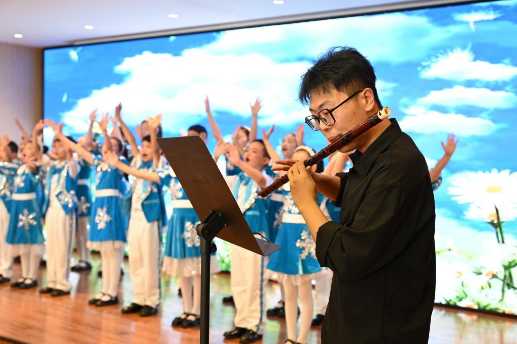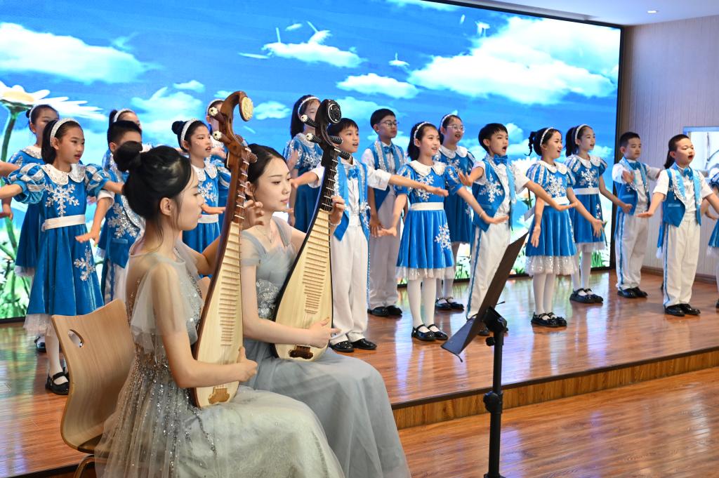 活动中,哈尔滨市少年宫小雪花合唱团儿童代表演唱希望工程主题曲《大眼睛》,学院学生以琵琶、竹笛为其伴奏,悠扬乐声与纯真歌声交织,重温着希望工程的初心与感动,传递出温暖而坚定的爱与希望,赢得现场阵阵掌声。